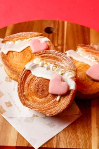 「ツリーリングス(年輪)」のような美しい円形に焼き上げたクロワッサン生地が特徴です。サクサクの層の中に、濃厚なキャラメルクリームと軽やかなホイップクリームを贅沢にダブルで仕上げました。食感のコントラストと、口の中に広がるキャラメルの香ばしさが堪能できる一品です。ホワイトチョコレートとピンクのハート形クッキーをあしらっています。