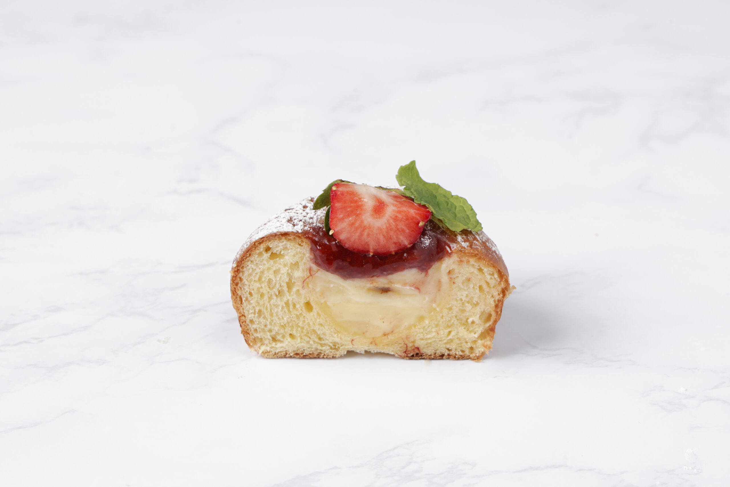 ブリオッシュ生地にカスタードクリームを絞って焼き上げ、苺のジャムをのせました。