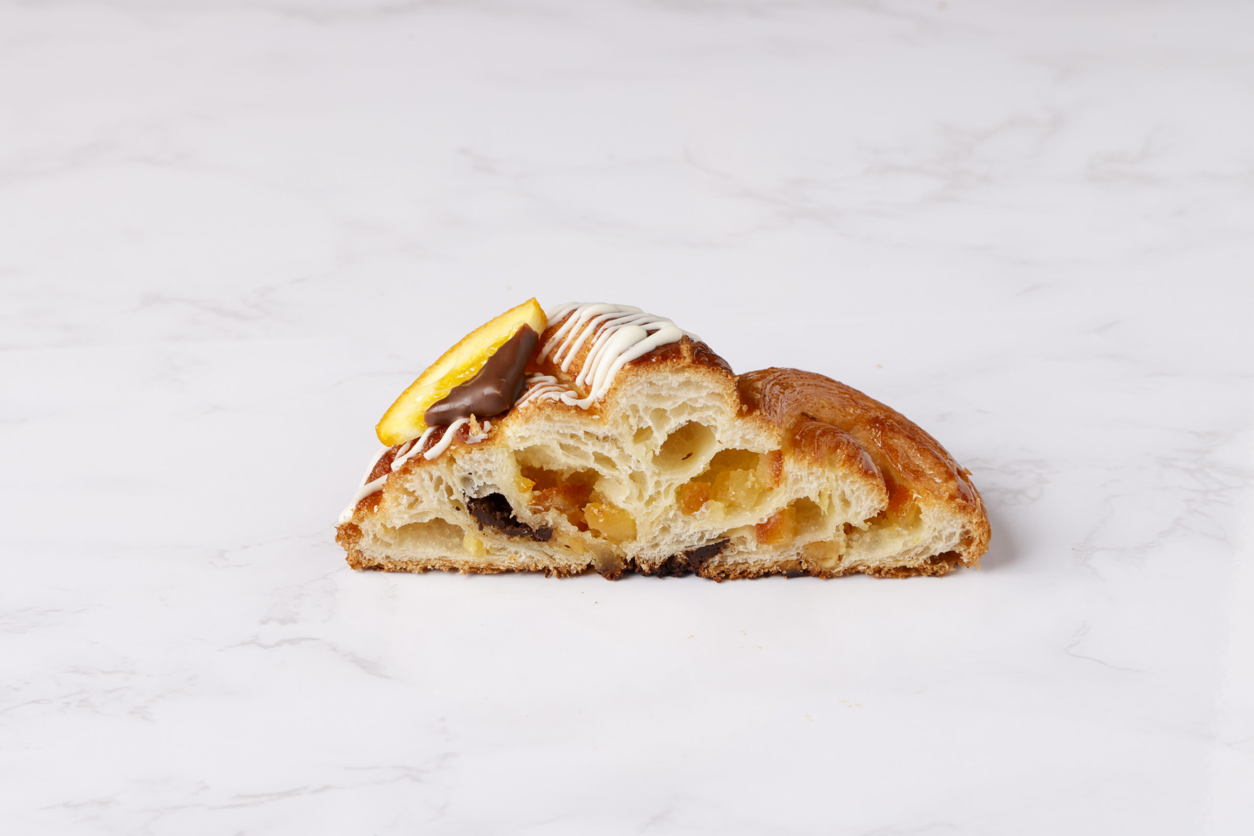 クロワッサン生地でオレンジとスイートチョコレートを巻いて焼き上げました。