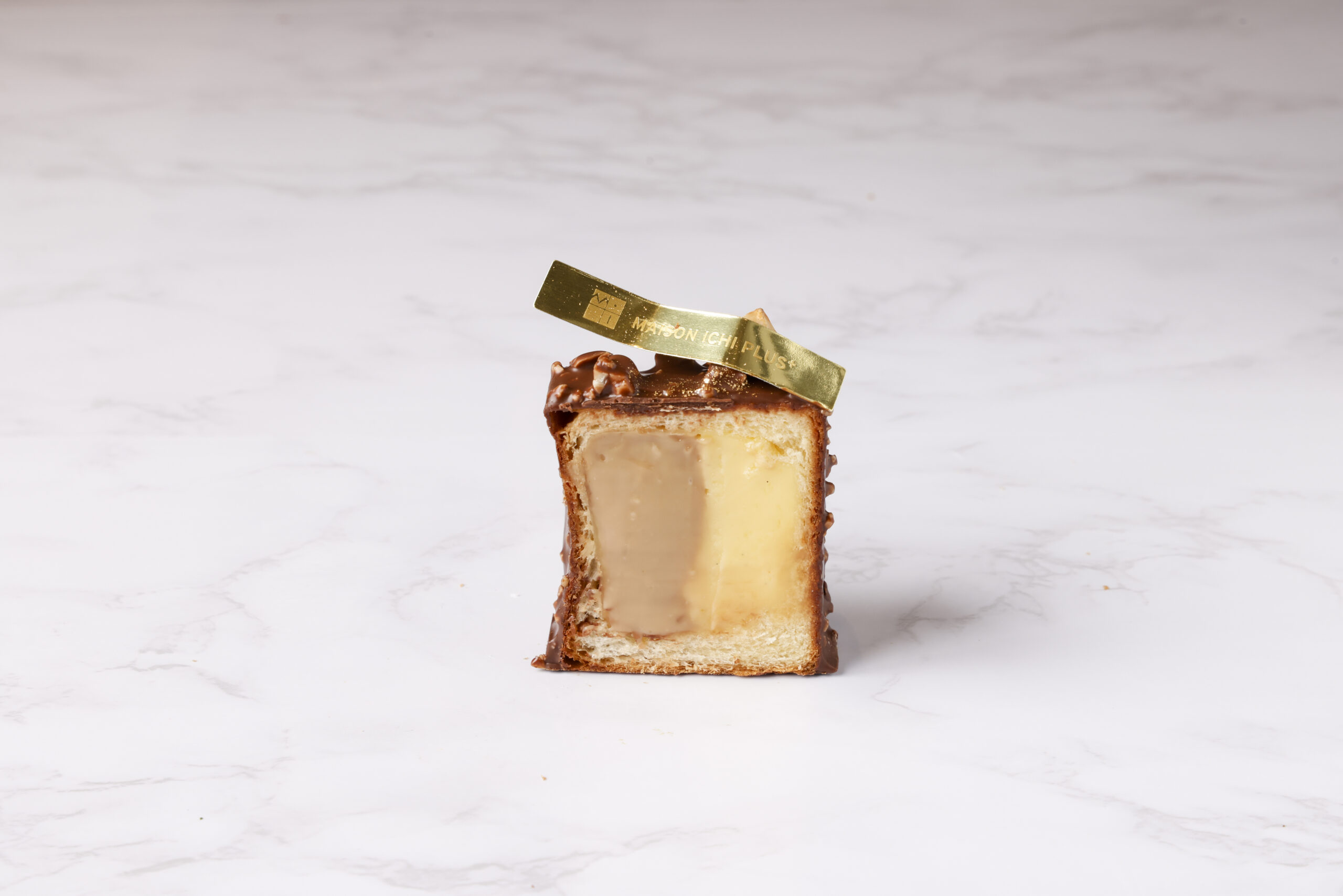 カスタードクリームとキャラメルクリームの2層のクリームパンをナッツ入りチョコレートでコーティングしました。