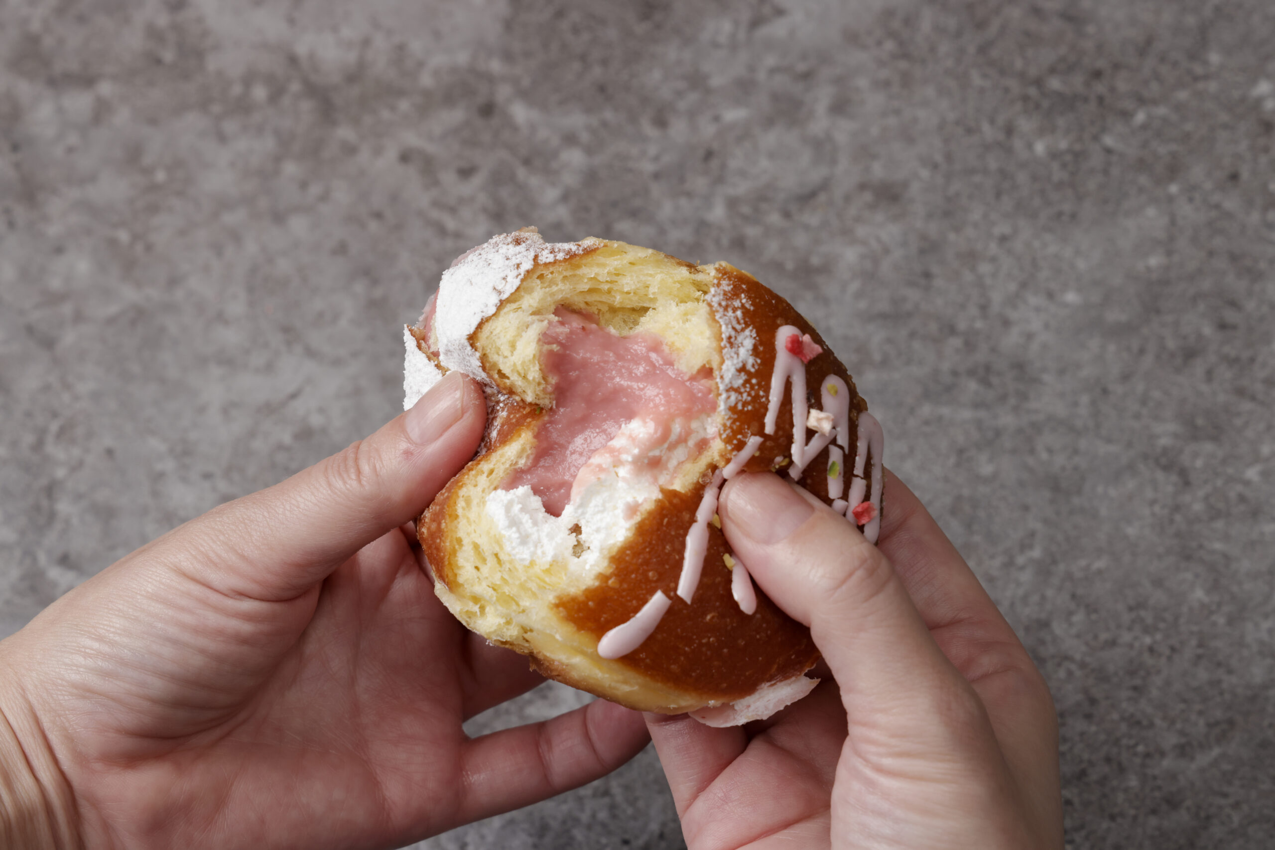 揚げたブリオッシュドーナツに苺クリームとホイップクリームを絞り込みました