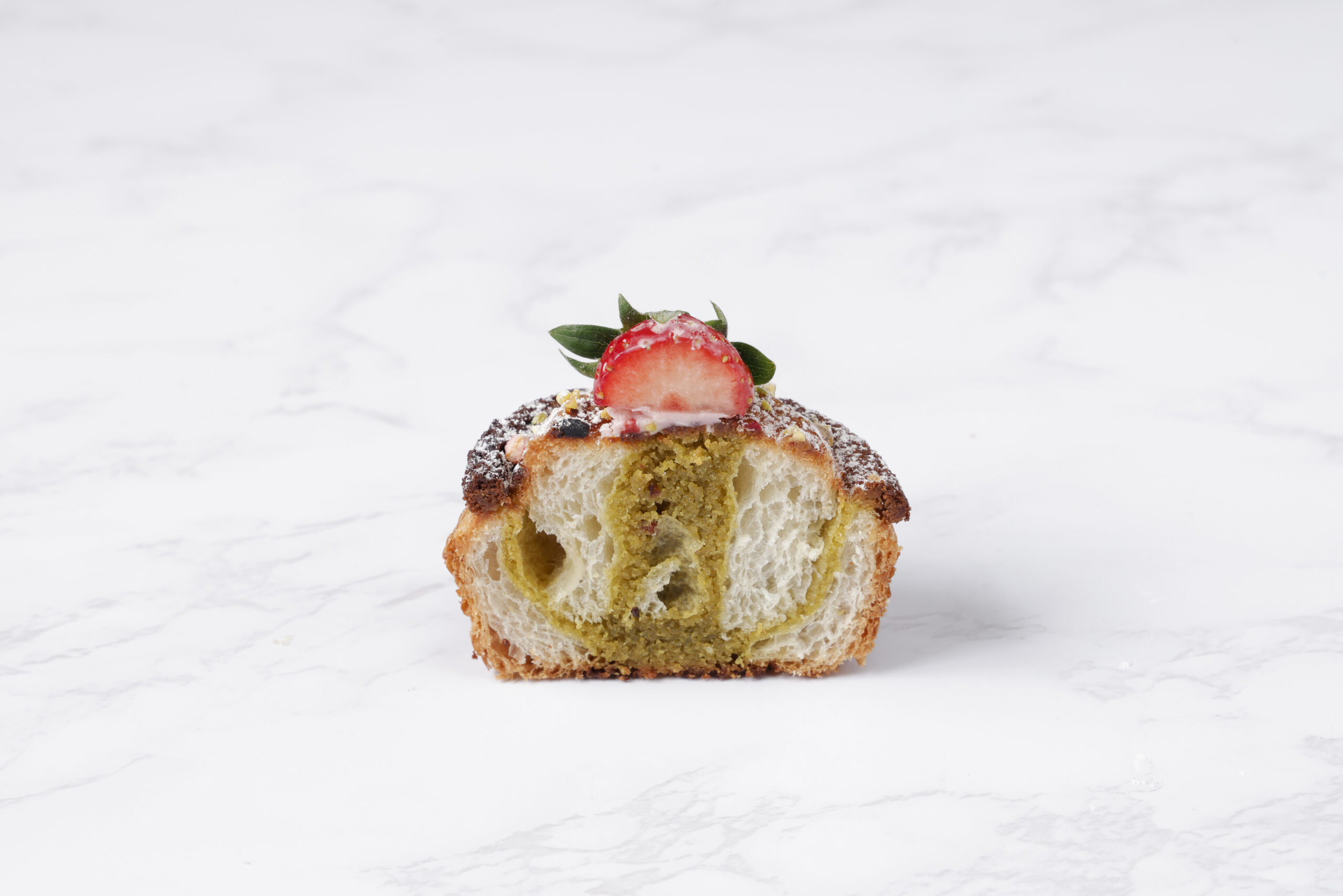 発酵バタークロワッサン生地にピスタチオのアーモンドクリームとフリーズドライ苺を巻いて焼きあげました