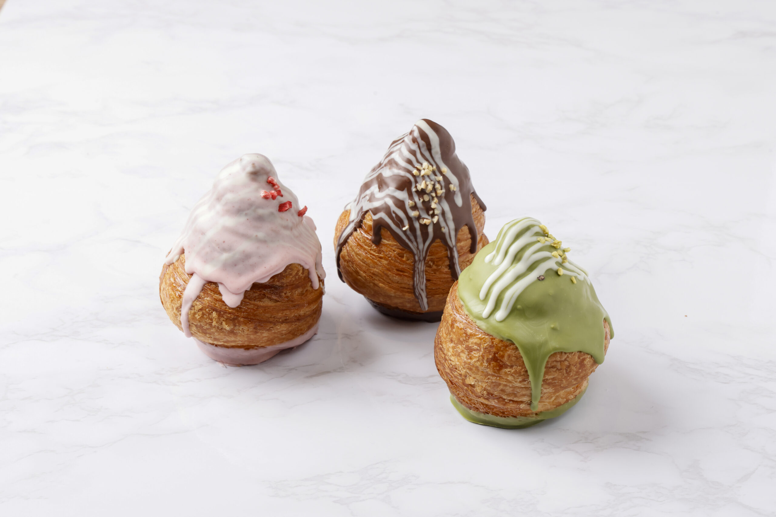 越谷クロワッサンに苺チョコとホワイトチョコをかけてマーブル模様に仕上げました。